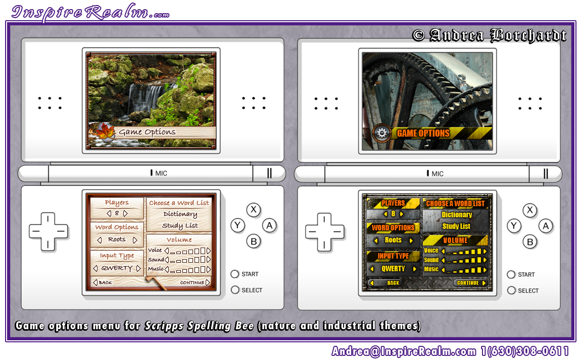 These are mockups done for a Nintendo DS game that features multiple skins for menus throughout the game. These two examples show opposing themes, nature and industrial. While the functionality of the menu remains the same, the player is able to customize the game to look drastically different. This particular menu is for changing settings to be used in the minigames that follow, and it makes liberal use of the Nintendo DS's touch screen.