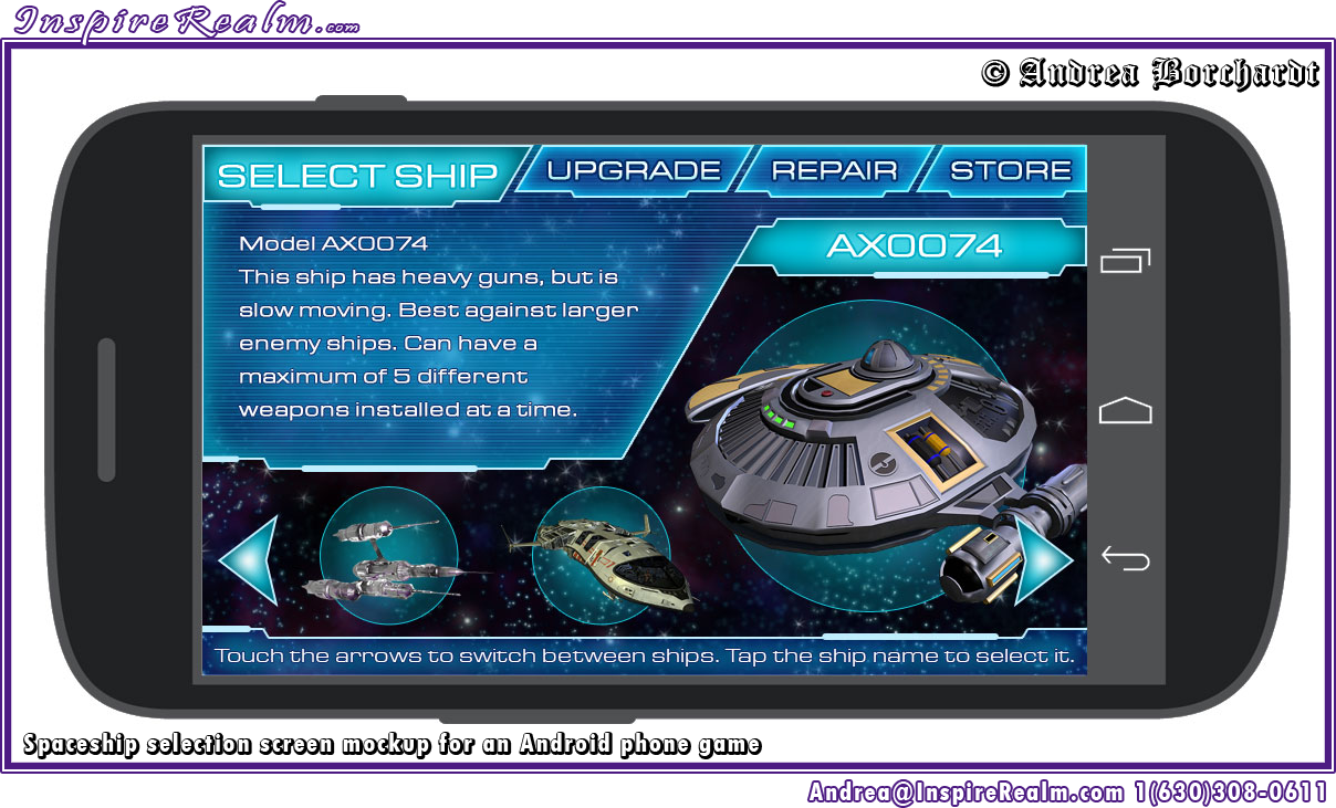 This is a selection screen concept for a spaceship game on an Android phone. All controls are touch screen based with appropriate prompts being listed on the bottom of the screen to help the player along the way. Different states of the menu can be accessed by touching the tabs (select ship, upgrade, repair, store). When the arrows are tapped, it scrolls between the available ships; the selected one enlarges as it moves to the right, and the next ship in line would appear from the left.
