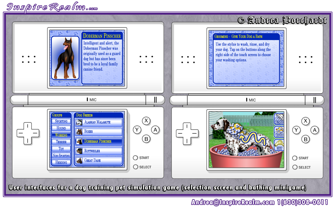 These screens were included in a high concept proposal document for a game about dog shows. The user interface on the left shows a selection screen for picking dog breeds in different categories. The right screen shows a minigame where you wash up your dog before the show starts.