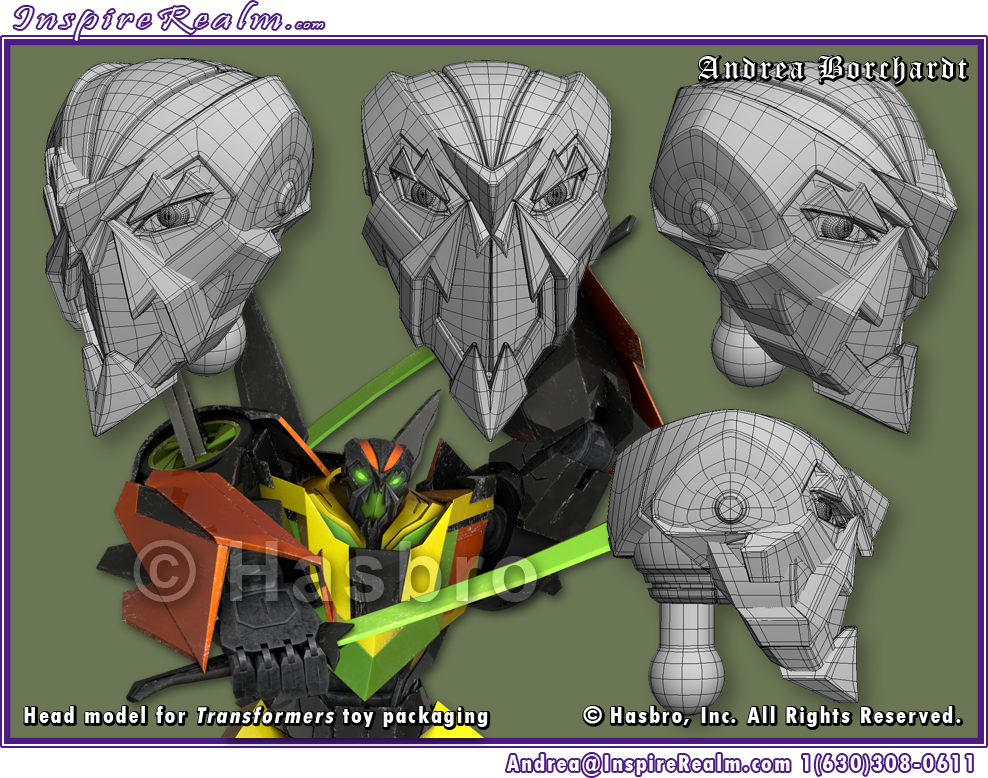 I modeled the head for this character based on a previous model that needed a lot of clean up work to make it render properly (thus remaking pretty much the whole thing). I was responsible for only the head geometry; the rest of the body model and the shaders/lighting were done by other team members. His completed render was used on packaging for Transformers: Fall of Cybertron action figures licensed by Hasbro, Inc.