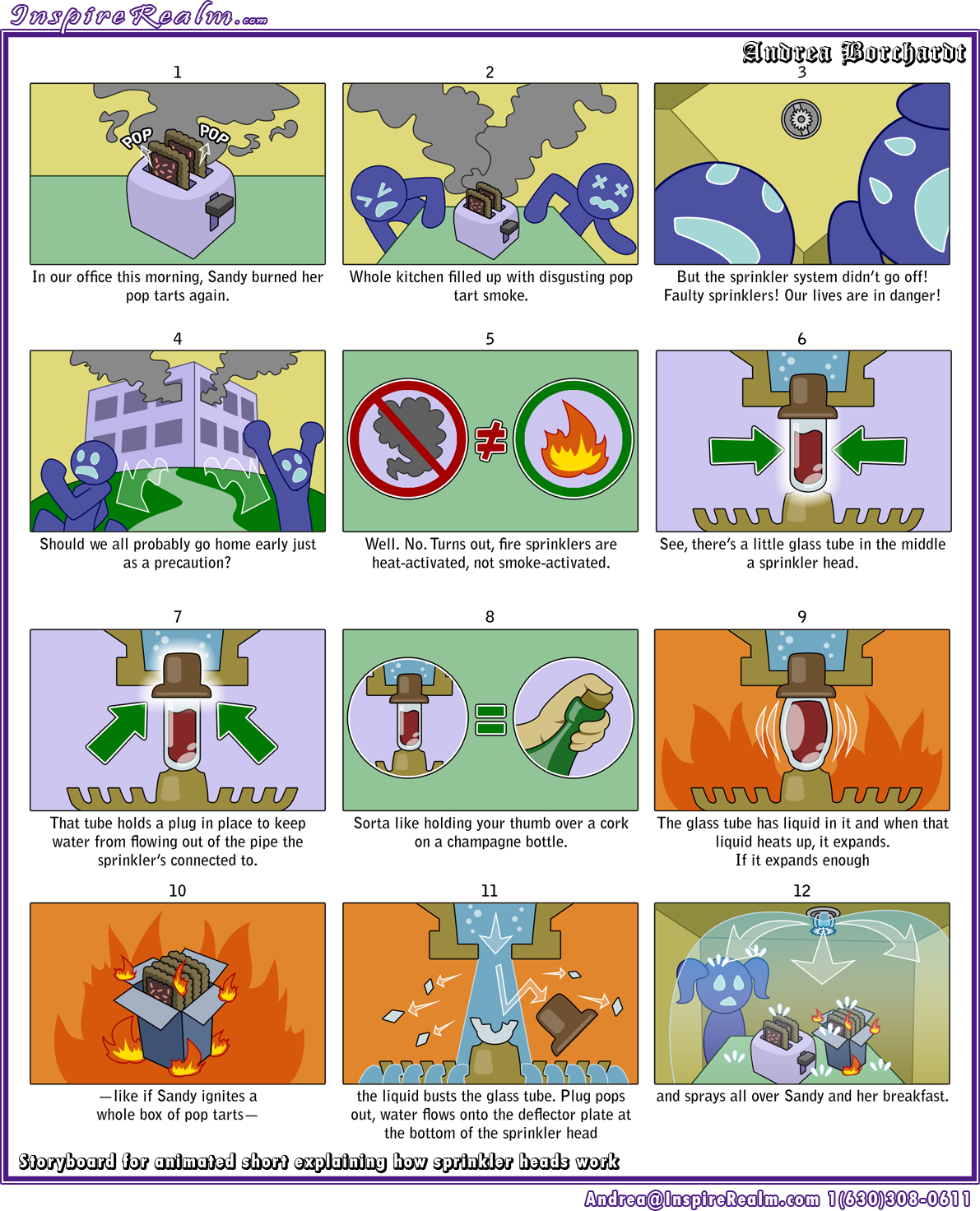 This storyboard was made for an art test. I created the visual representation here, while the concept and script were provided by Jellyvision Labs. The piece was completed entirely in Photoshop after much research to figure out what sprinkler head parts actually looked like.